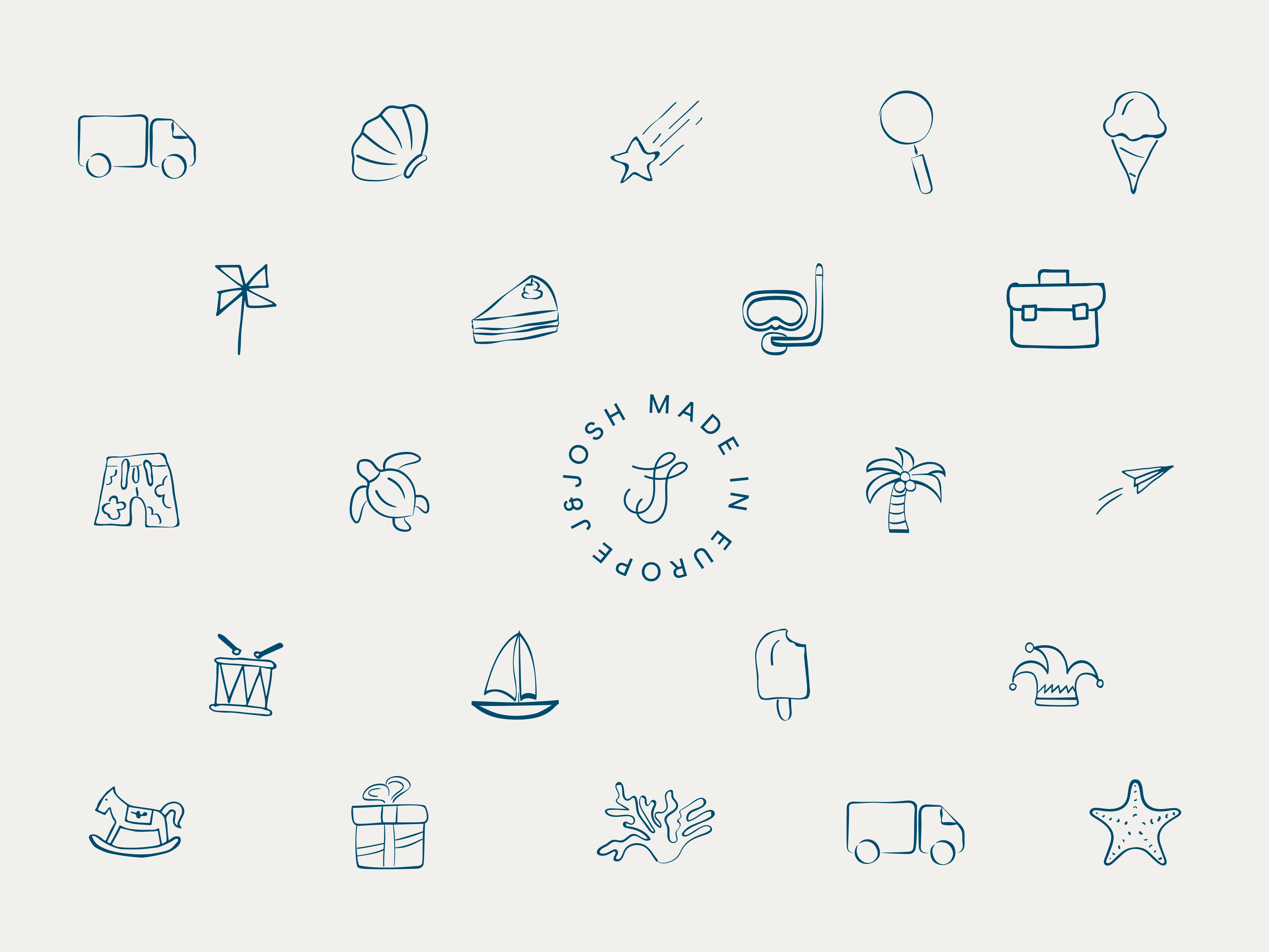 As part of the brand refresh, I developed a suite of hand-drawn icons to add a playful, childlike dimension to J&Josh’s visual identity. Each illustration ranging from seashells and turtles to kites and musical instruments, was designed to capture the spirit of childhood curiosity, adventure, and imagination.